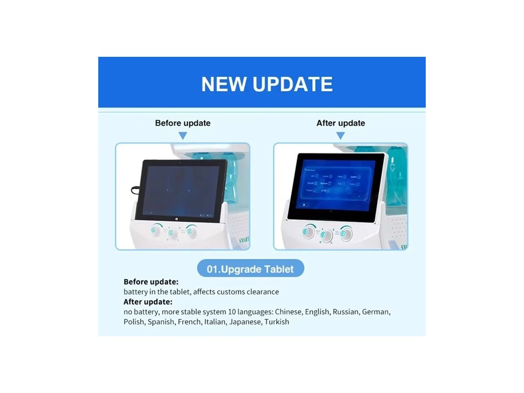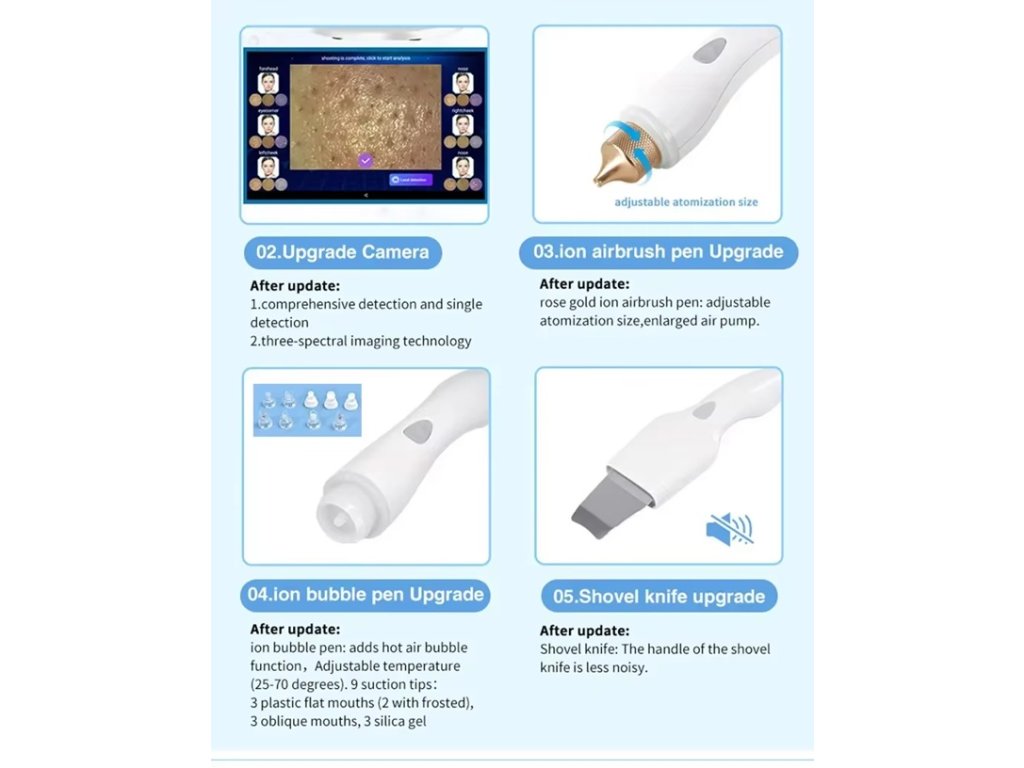 1. Aparat facial cu hidrodermabraziune 7 în 1. Sistemul de tablete este modernizat. Tableta nu are baterie, deci nu necesită trecerea prin vamă și nu este detectată de cameră, putând fi utilizată după pornire, iar funcționarea interfeței este simplificată.