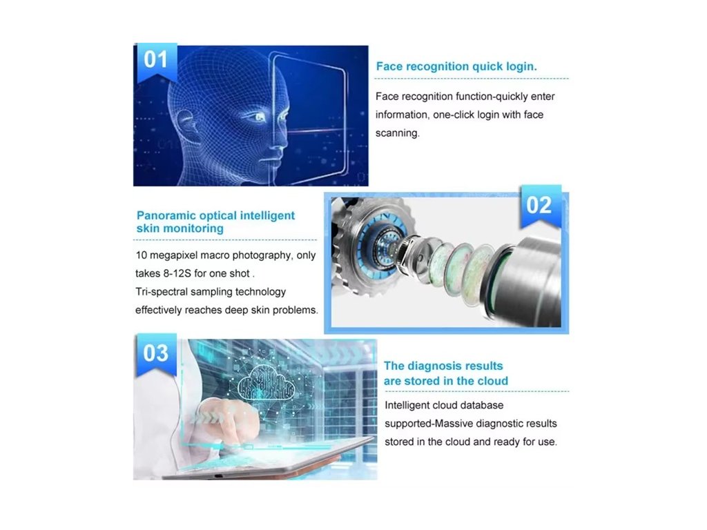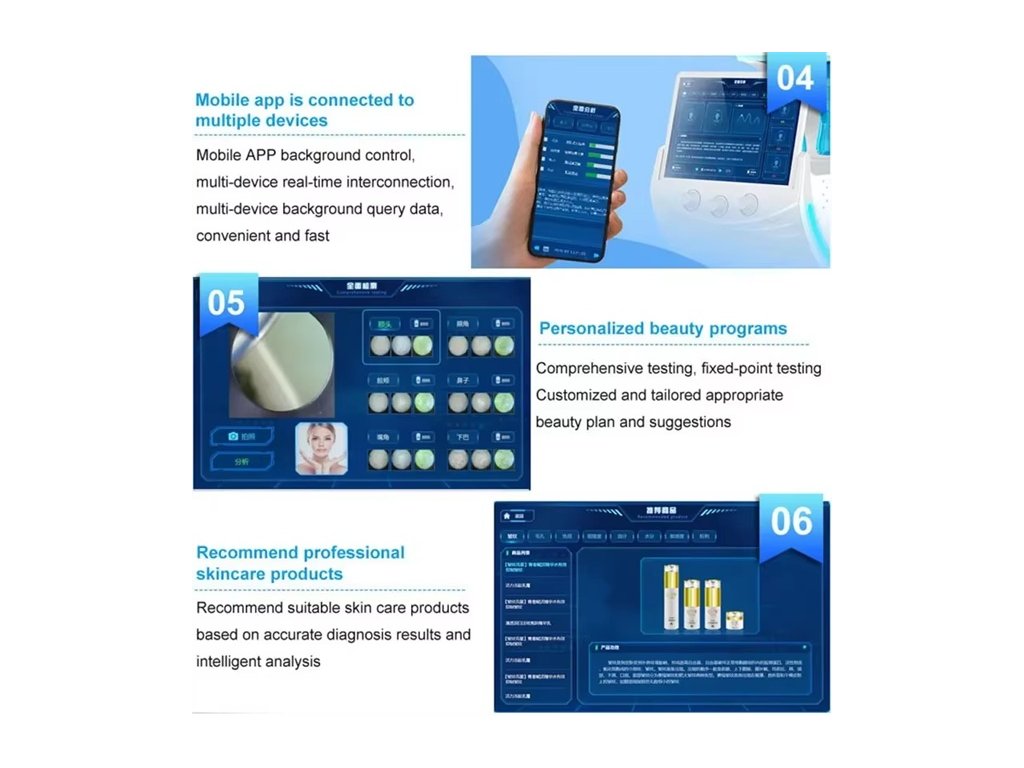 Aparatul inteligent Ice Blue Pusl utilizează o cameră macro de înaltă definiție de 24 de milioane de pixeli, combinată cu tehnologie de imagistică trispectrală, pentru a realiza fotografii detaliate ale pielii feței, a o analiza inteligent cu motorul principal de inteligență artificială, a detecta problemele pielii în 8 dimensiuni și a personaliza programele de înfrumusețare pe baza rezultatelor. Recomandă inteligent produse profesionale de îngrijire a pielii; șase funcții de înfrumusețare cu configurație largă, combinate cu paletă, stilou ionic cu bule, stilou aerograf ionic, ultrasunete, radiofrecvență aurie, cap de gheață și alte tehnologii. Tratament complet al pielii, combinat cu rezultatele diagnosticării testelor cutanate prin inteligență artificială, potrivirea țintită cu produse de îngrijire a pielii și alte articole de îngrijire a pielii, pentru a dezvolta un dispozitiv integrat multifuncțional pentru testarea și îngrijirea pielii.